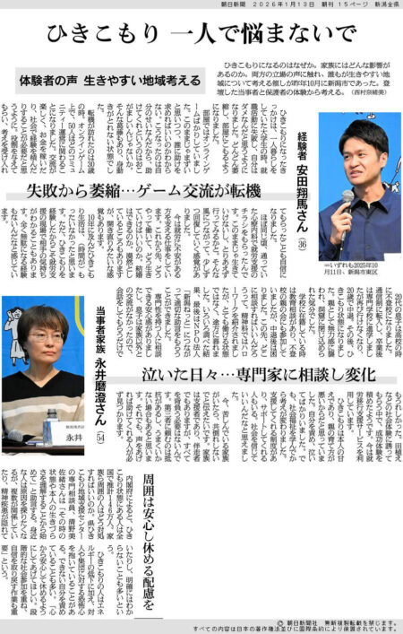 2025年10月に新潟市(東区)で開催されたひきこもりVOICE STATION【主催:厚生労働省】にご登壇いただいたお二人のお話を朝日新聞さんに記事にしていただきました。『ひきこもり 一人で悩まないで』のタイトルが印象的です。お二人からは当事者ならではの言葉を発信していただきました。ご本人、ご家族それぞれに物語や苦悩があり、僕たち福祉側は何が出来るのか?いつも考えさせられます。この問いや思考を止めないように2026年も頑張ります!!